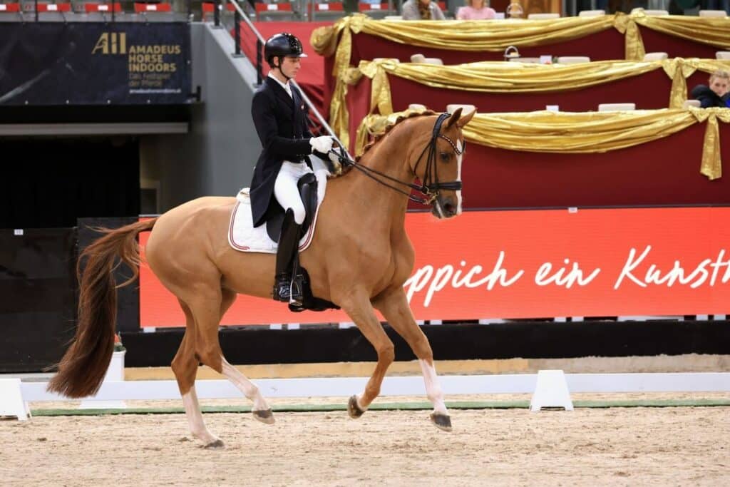 Den Höhepunkt des ersten Dressurtages markierte der AMADEUS DRESSAGE CDI3* GRAND PRIX: 11 Paare ritten hier um den Sieg im Preis der DANESH Teppiche. Letztes Jahr von der Atmosphäre noch deutlich beindruckt, präsentierte sich der elfjährige in Westfalen gezogene Hengst Valverde NRW unter Yara Reichert (GER) heute besonders ausdrucksstark in der Piaffe-Passage-Tour. Mit 68.543% übernahmen sie nach der Hälfte im Classement vorerst die Führung. Doch Timna Valenta-Zach (AUT) löste mit einer präzisen Runde auf dem Spielberg-Nachkommen Farant das deutsche Paar direkt ab und erhielt für ihre präzise Vorstellung 69.804%.